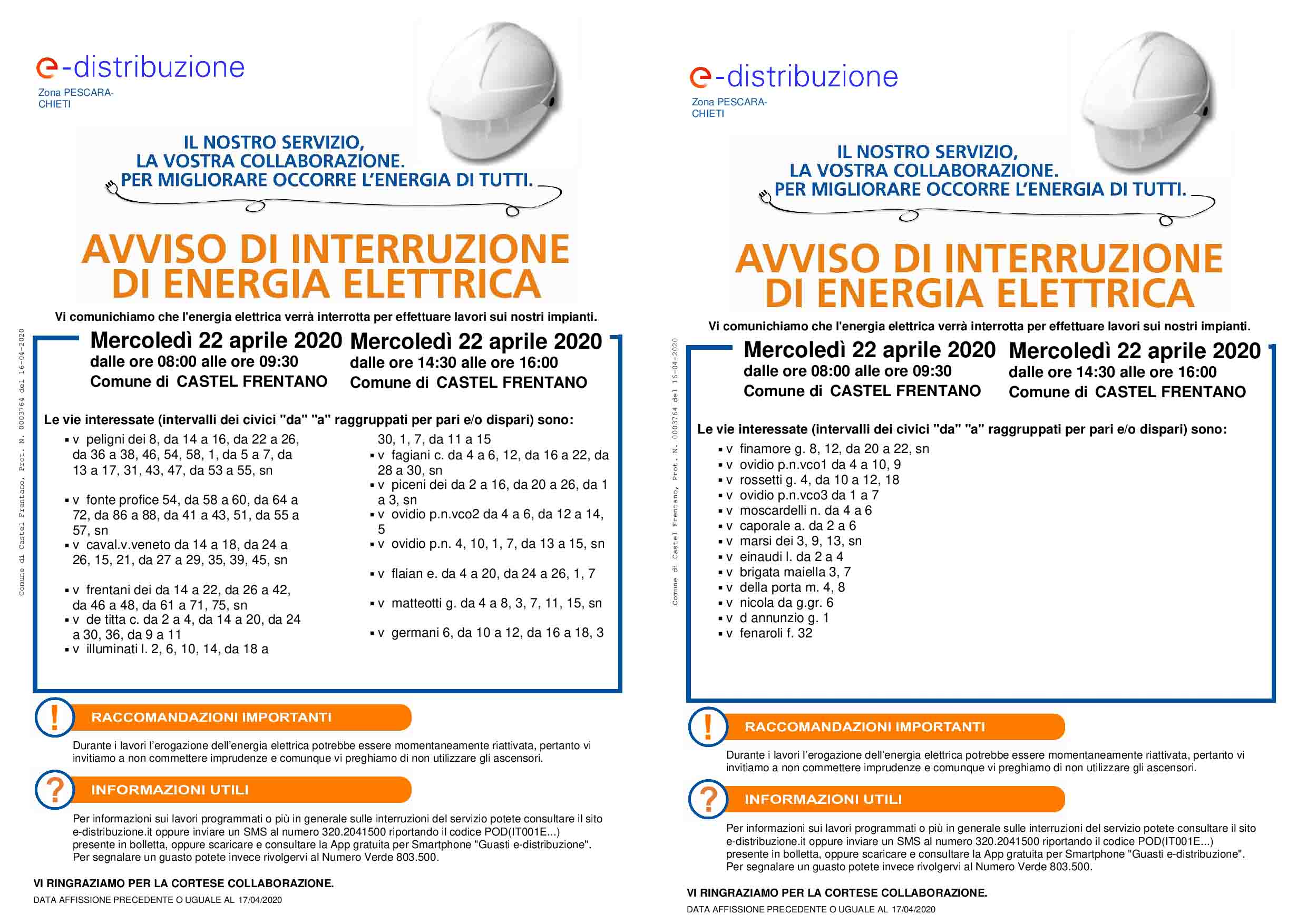 E-Distribuzione comunica che, per effettuare lavori sugli impianti, l’energia elettrica verrà interrotta nel giorno di mercoledì 22 aprile 2020 dalle ore 08:00 alle 09:30 e dalle ore 14:30 alle 16:00.