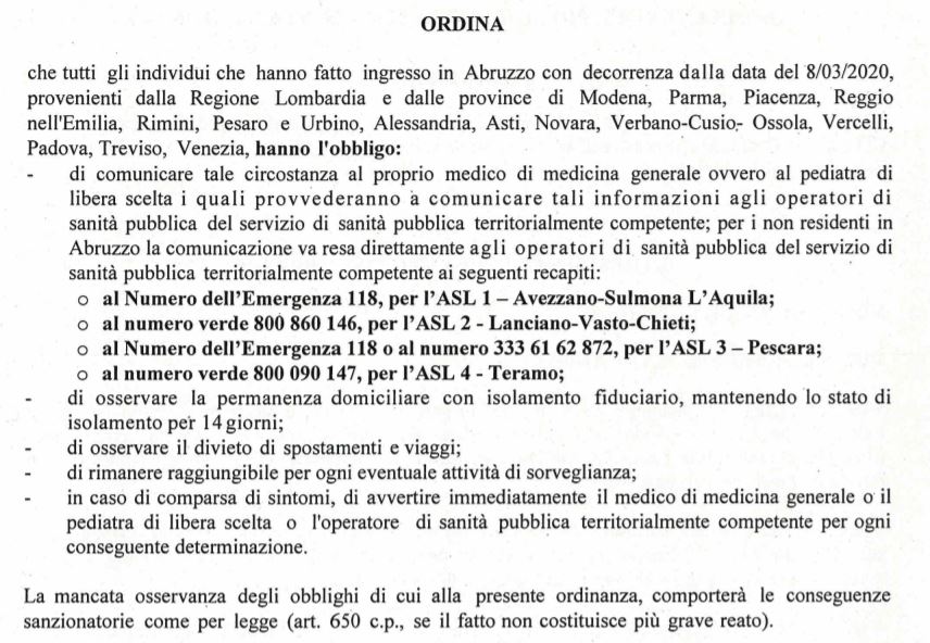 La Asl Lanciano Vasto Chieti ha messo a disposizione dei cittadini il numero verde 800860146 attraverso il quale i medici incaricati dall’Azienda rispondono alle richieste di informazioni e danno indicazioni sulle misure per il contenimento del contagio. Il servizio è attivo 24 ore al giorno.