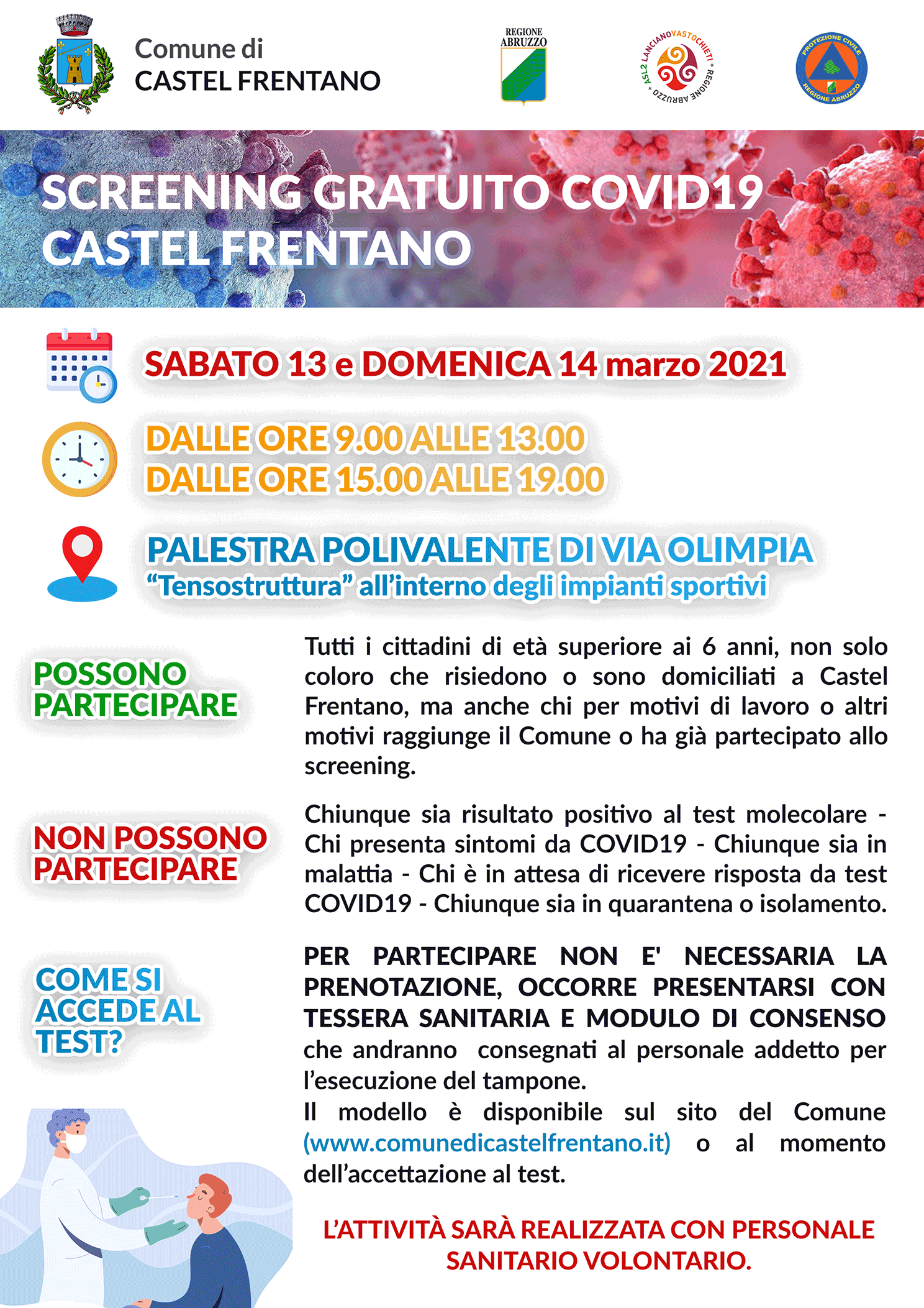 CASTEL FRENTANO. Parte sabato 13 e domenica 14 lo screening gratuito di massa con tamponi antigienici rapidi a Castel Frentano.