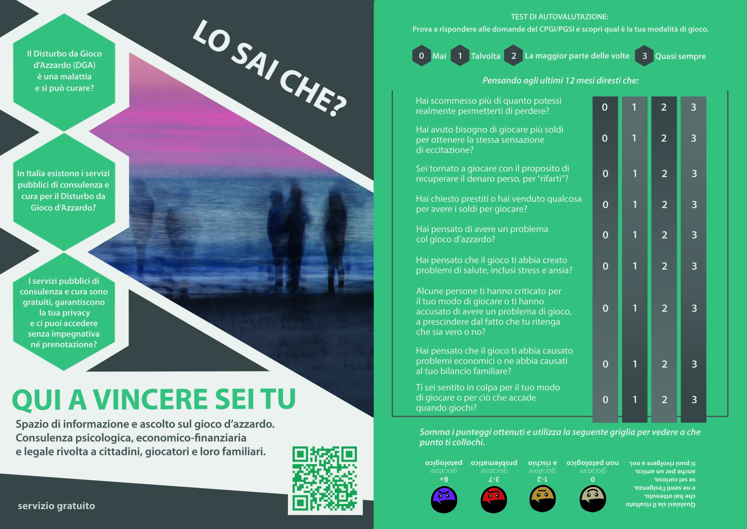 Ci sono rischi di salute legati al gioco d’azzardo, campanelli d’allarme che non vanno sottovalutati. Nella locandina sono elencati contatti telefonici e luoghi in cui ci si può recare per una richiesta d’aiuto. Non indugiate, in caso di bisogno contattare gli esperti che vi offriranno il loro indispensabile e prezioso supporto.