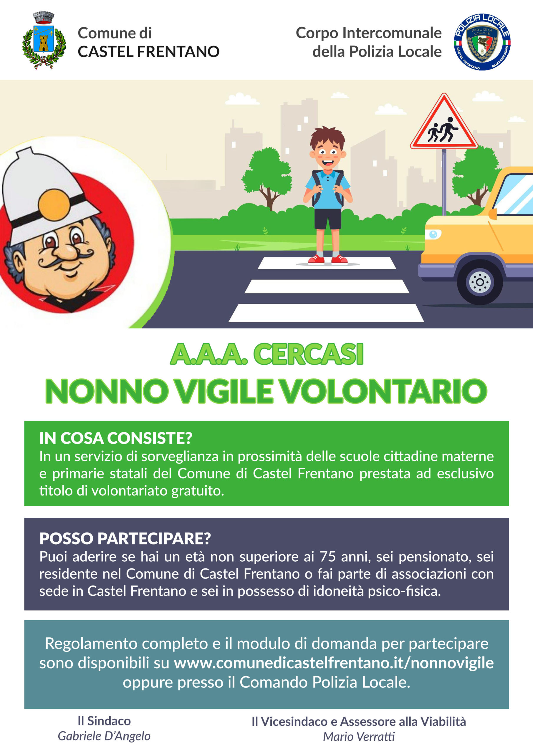 L’Amministrazione Comunale rende operativo il servizio “Nonno Vigile Volontario” istituito e disciplinato con deliberazione del Consiglio Comunale n. 36 del 08.10.2021, pertanto, comunica che sono aperte le iscrizioni per aderire al servizio “Nonno Vigile Volontario”.