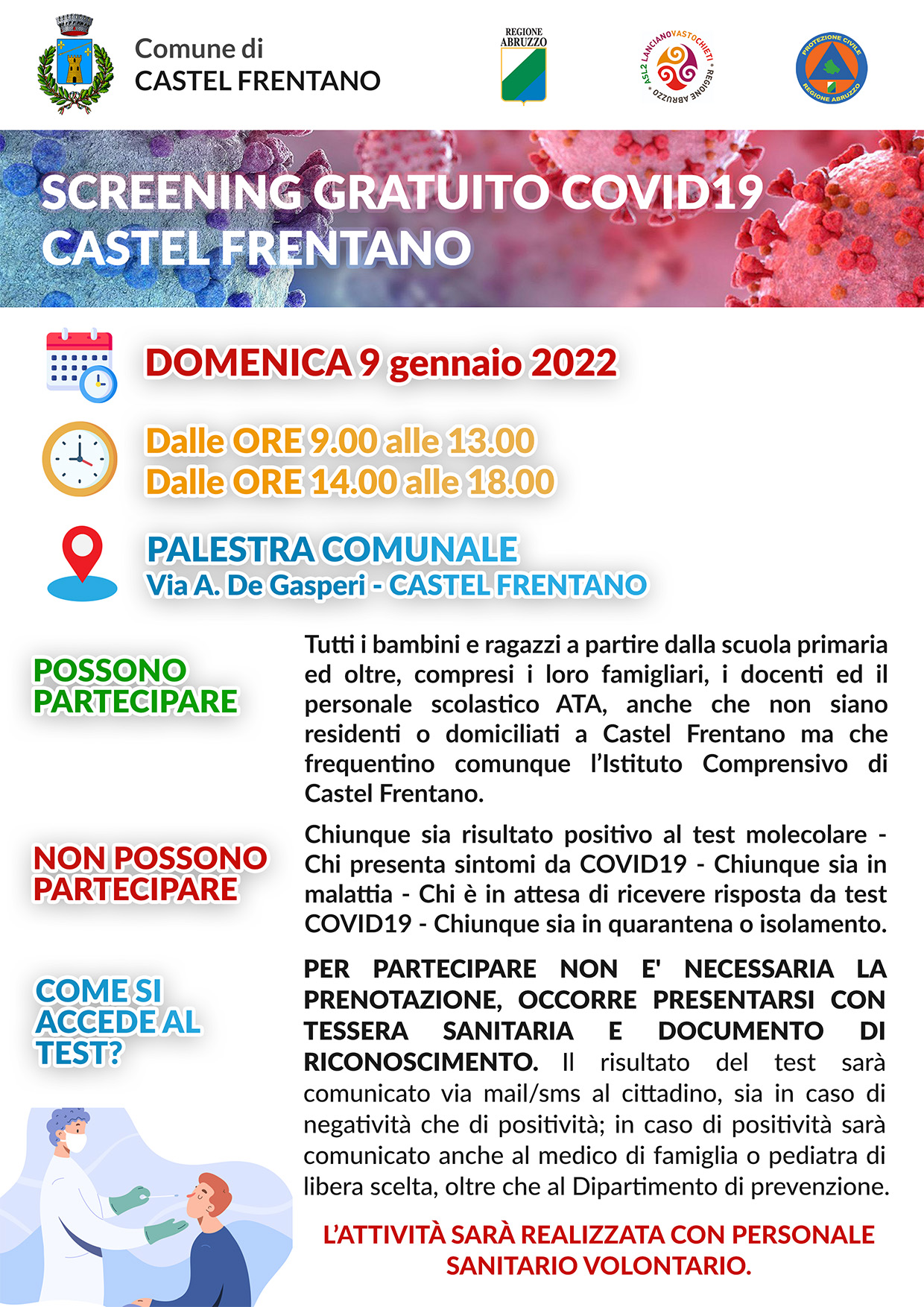 SCREENING DI MASSA SARS-CoV-2/COVID-19 GRATUITO A CASTEL FRENTANO DOMENICA 9 GENNAIO 2022 IN VIA DE GASPERI (PALESTRA COMUNALE)