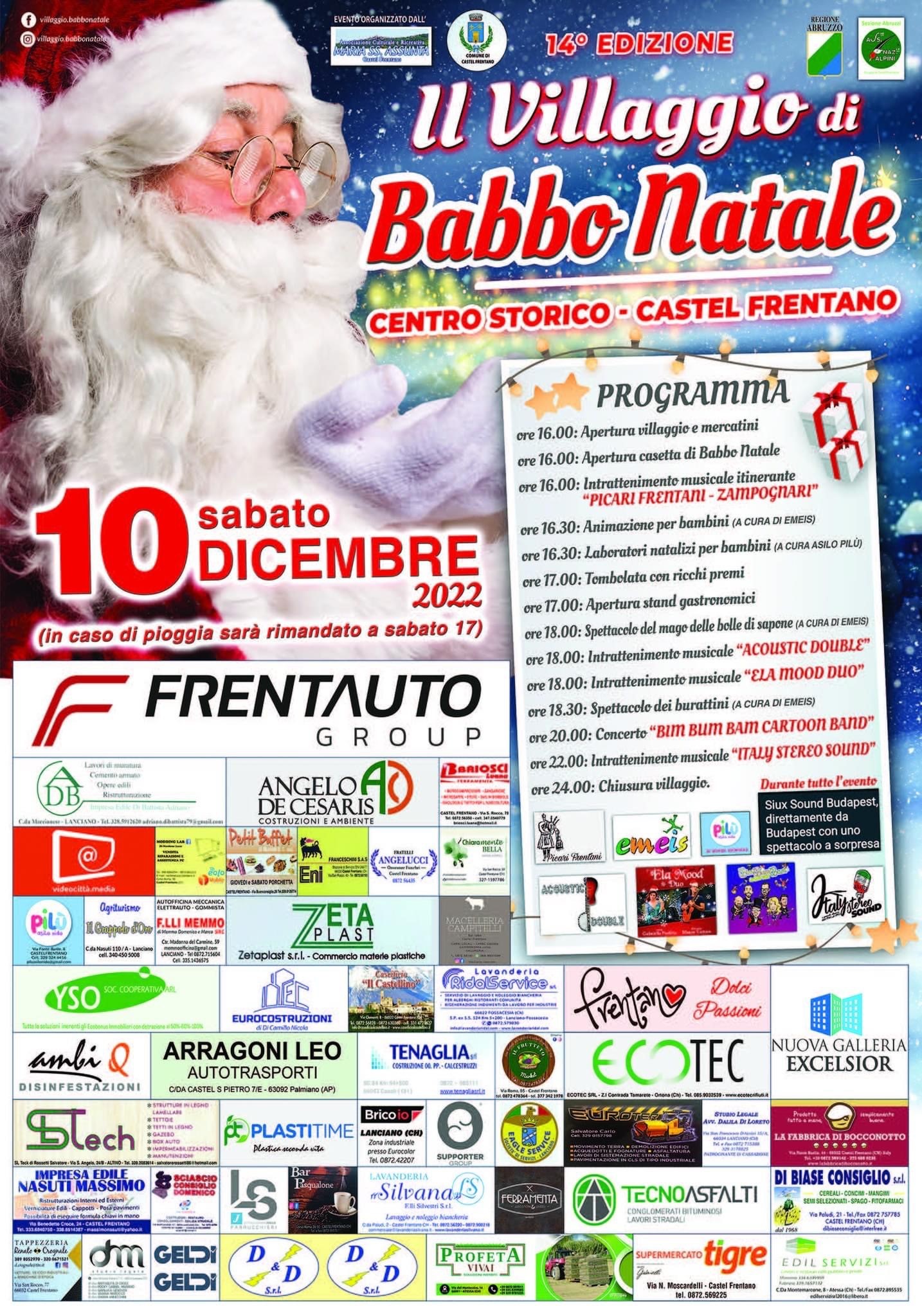 Sabato 10 dicembre torna, per la 14esima edizione, il Villaggio di Babbo Natale. Nel centro storico di Castel Frentano, dalle ore 16.00 in poi, una giornata di divertimento per tutta la famiglia con stand gastronomici, mercatini di Natale, attrazioni per bambini e tanta musica.