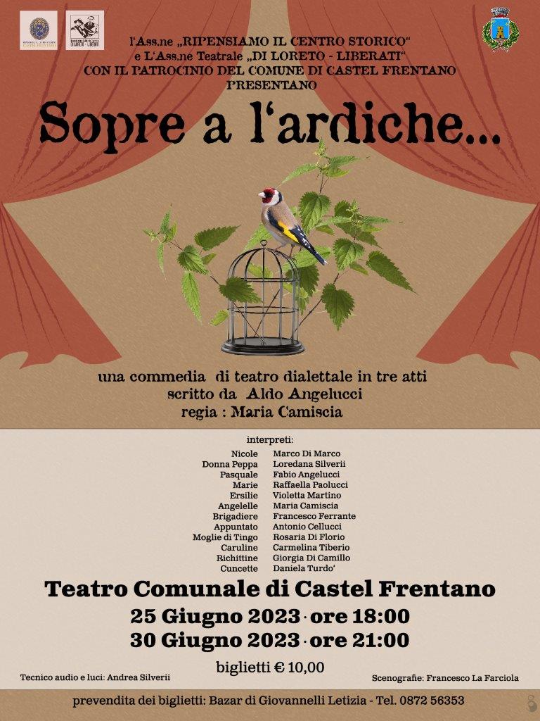 Siamo ben lieti di aver dato il patrocinio alla rappresentazione della commedia dialettale, in tre atti, “Sopre a l’ardiche…”, a cura delle associazioni “Ripensiamo il Centro Storico” e “Teatrale Di Loreto-Liberati”, e scritta dal castellino Aldo Angelucci.